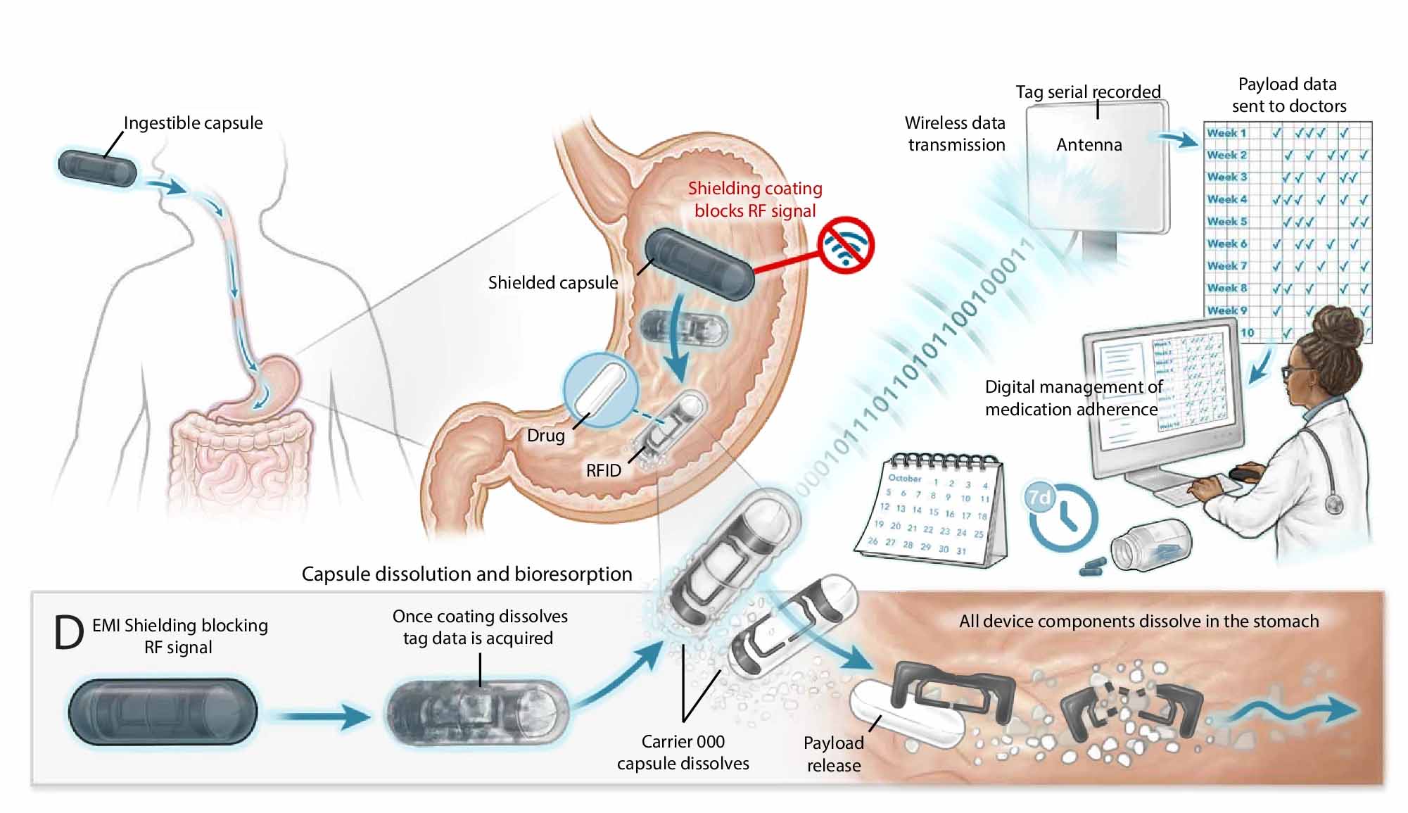 按時服藥對控制病情非常重要,但有不少病人因忘記服藥而影響療程。麻省理工學院(MIT)研究團隊公布新型膠囊,由纖維素、明膠、鉬或鎢等可消化材料混合而成,內建微型無線射頻識別(RFID)天線。當無線電膠囊進入人體消化道並溶解後,10分鐘內塗層會分解,開始釋放藥物及射頻訊號。膠囊能在消化道內完整保持數周,且按計劃釋放藥物。