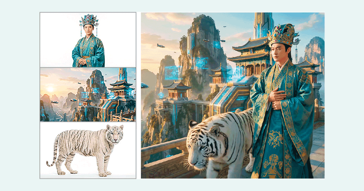 示範短片可見,用戶可先在Gemini 3 Pro Image建立影像素材,再上傳穿着古裝的帝王(人物)、科幻中式場景(背景),以及白老虎(物件)等3張影像,Veo 3.1即可將不同的素材,組合為一條8秒長的短片。