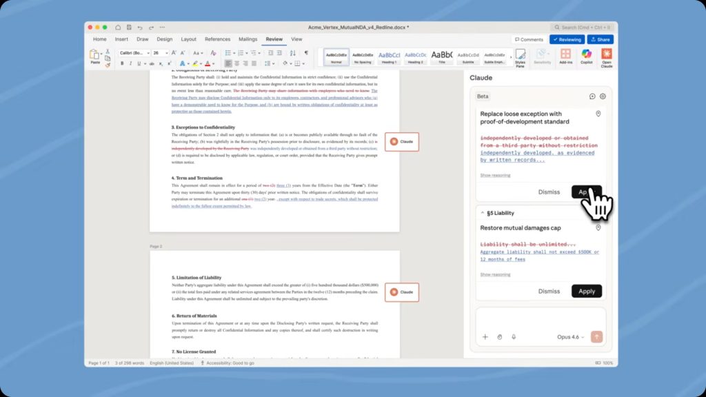 Claude for Word能夠讀取複雜的文件結構,包括多層法律編號、定義術語、交叉引用及標題層級,現階段僅支援docx與docm格式。這款工具針對專業人士,特別是經常處理文件的法律審核、財務備忘錄撰寫,以及反覆修訂工作者。用戶使用Word編輯文件時,毋須跳出應用程式或另外貼上文本,Claude介面側邊會顯示所有AI建議的改動部分,以Word原生的「修訂模式」呈現,方便如人手標註一樣審閱修改。